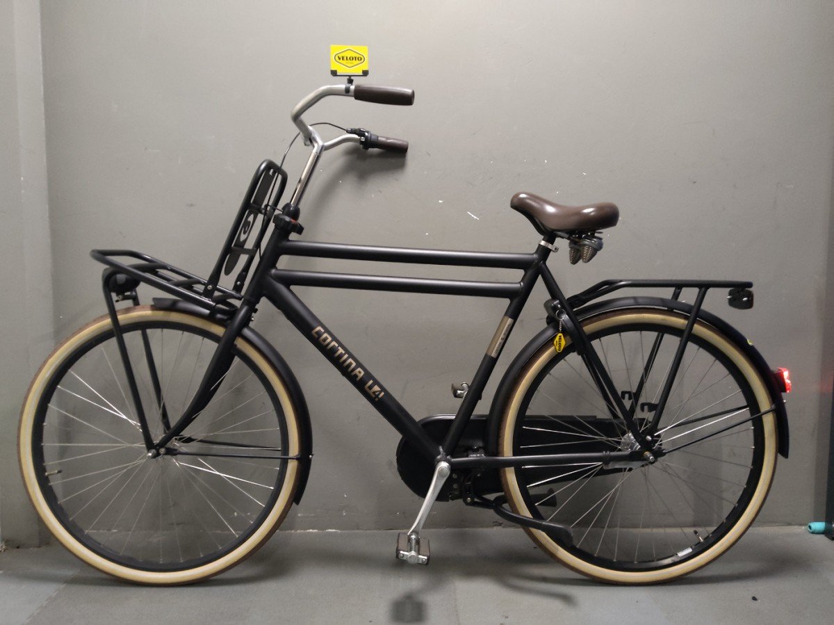 Cortina Transport U4 herenfiets in framemaat 61cm. Kleur: Jet Black Matt. Uitgerust met achter een Shimano Nexus 3-traps versnellingsnaaf met terugtraprem en voor een standaard naaf. Opvallende details: aluminium frame, stuurslot, voordrager.